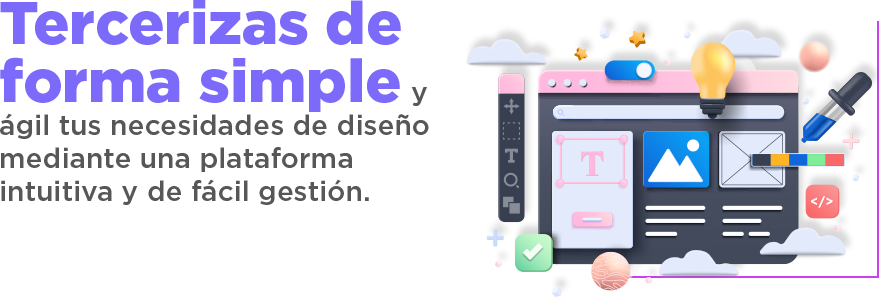 No tienes que ser un experto en diseño, ya que ponemos a tu disposición un formulario de solicitud que simplifica la manera en la que pides los trabajos y además contarás con un motor creativo con IA que te ayudarán a generar ideas para tus solicitudes. Tu solo proporcionarás instrucciones breves acerca de lo que necesitas de manera cómoda y automatizada.
